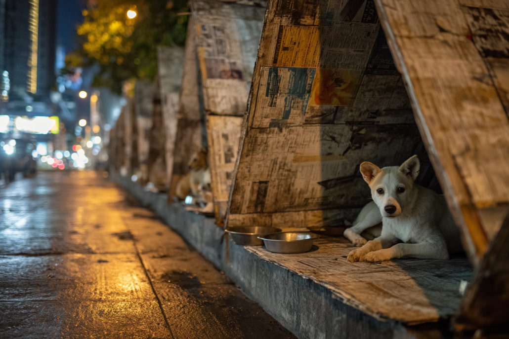 Na Tailândia, o problema dos cães de rua tem sido uma questão crescente. Em Bangkok, estima-se que haja entre 100.000 e 300.000 cães sem abrigo, que vagam pelas ruas da cidade, enfrentando condições precárias como acidentes, abuso e exposição às condições climáticas extremas. Em resposta a esse problema, a organização Stand for Strays criou uma solução inovadora para oferecer proteção aos cães de rua: o Homeless Allot Model.